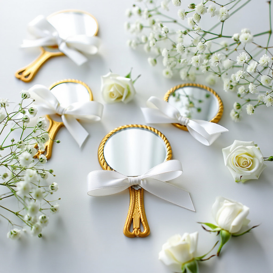 Un petit miroir raffiné, parfait comme cadeau pour vos invités. Décoré d’un ruban blanc élégant, il apporte une touche délicate et personnalisable à votre évènement.